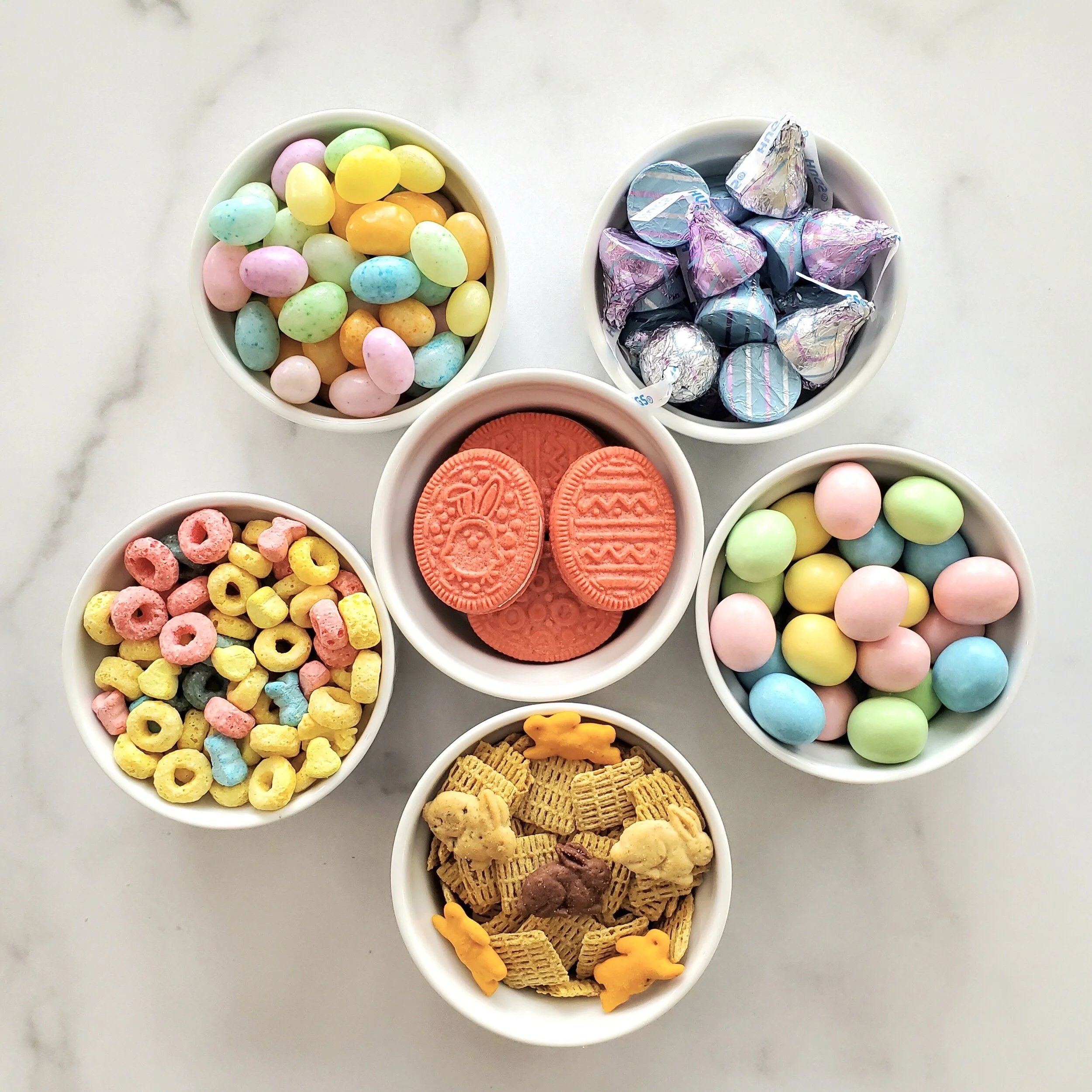Our Hop To It Snack Mix starts by setting out all of the ingredients and unwrapping what you need first. To assemble, think about making a lasagna. Spread an even layer of the cheese bunnies or crackers, the grahams, the cereal, and then the sandwich cookies. Combine the Hop To It Snack Mix together. Next up, layer the jellybeans, coated chocolate eggs, and seasonal candy, followed by the Hershey’s kisses. Mix carefully by hand all of the ingredients. Try not to sneak a bite! Finally, top with the Peeps.